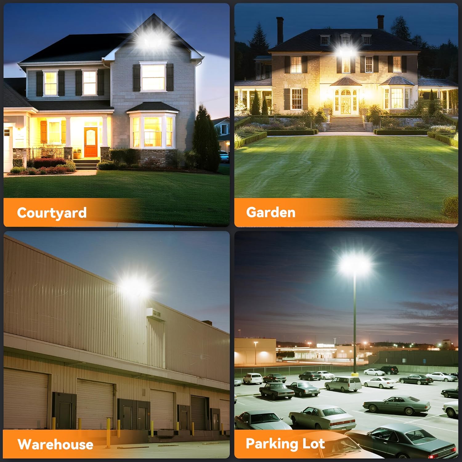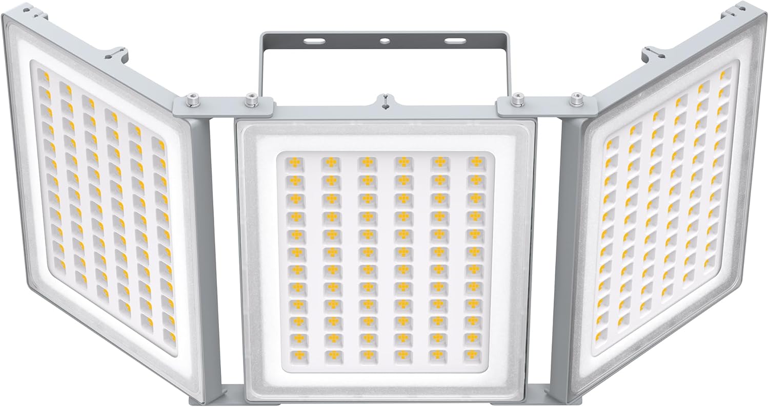Wide Application:This 300W three-head floodlight is hard-wired and ideal for use in garages, basketball courts, stadiums, warehouses, workshops, parking lots, basements, and more. It provides bright, comfortable lighting that meets a wide range of outdoor lighting needs, ensuring that every corner is well-lit