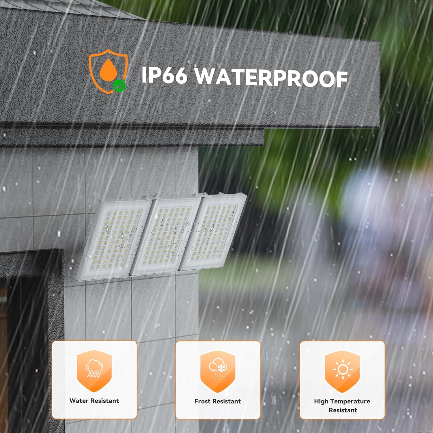 IP66 Waterproof: This led stadium lights is IP66-rated for waterproof and dustproof protection, performing reliably in harsh weather like rain, snow, heat, or cold. It’s perfect for indoor or outdoor use, lighting up garages, basketball courts, driveways, or entrances with dependable, weather-resistant illumination for added security